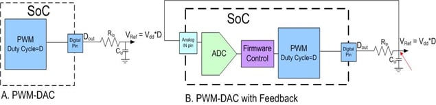The pulse width can be varied to change Vref, but the PWM-DAC method is an open loop system and thus it is advantageous only when the supply voltage is highly accurate. If the supply voltage has error, then output reference voltage will also have error. Obtaining an accurate supply voltage is expensive and thus not available in low cost systems. To compensate for the change in supply voltage, a closed loop system can be formed by using an ADC and firmware control as shown in Figure 2B. The reference voltage value is measured using the ADC and the duty cycle of PWM is adjusted in the firmware to obtain the required reference value. This feedback loop will reduce the dependency on the supply voltage, but adds latency and uses more resources in the system.