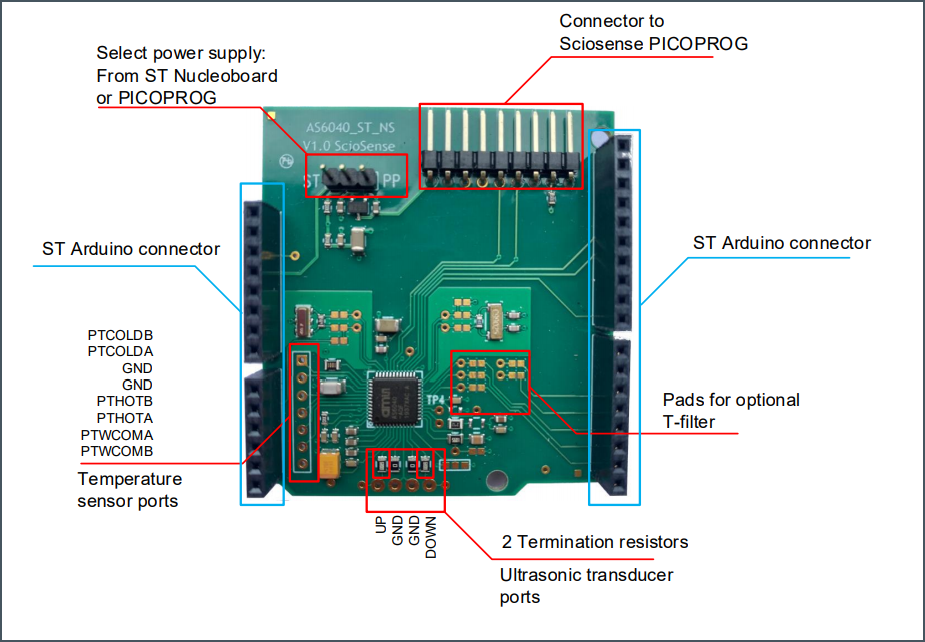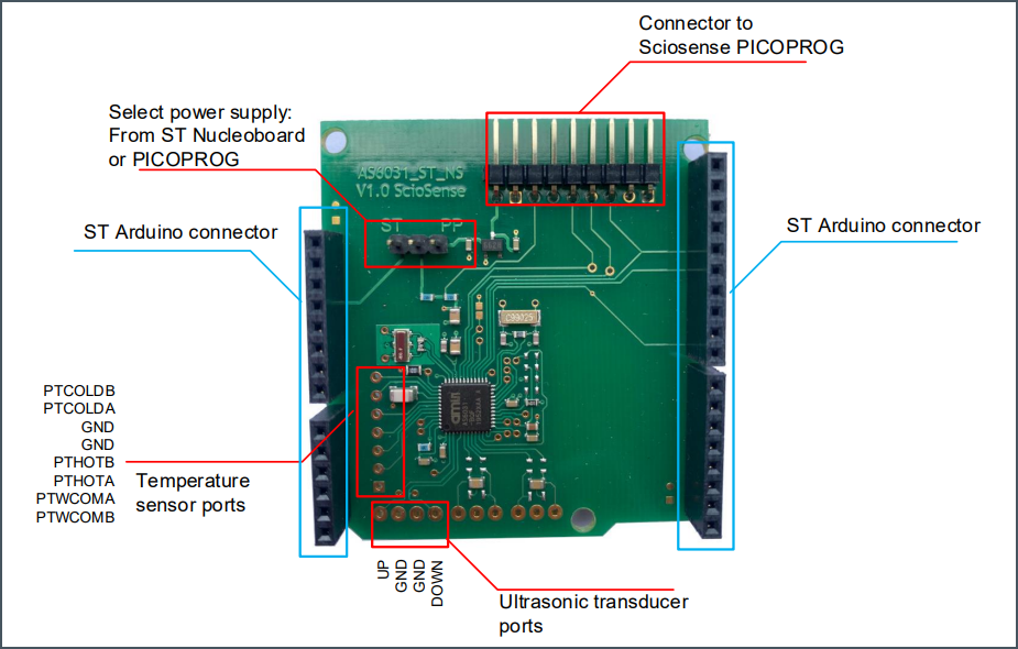 ScioSense UFC ST Nucleo Shields Expansion Boards can easily be combined with ST development kits and ScioSense evaluation kits. The boards feature two rows of connectors that fit into the ST Nucleo boards. An additional connector is available to use with the PICOPROG interface. Shields are available for TDC-GP30YA-F01 (with flow firmware), AS6031, and AS6040.Features